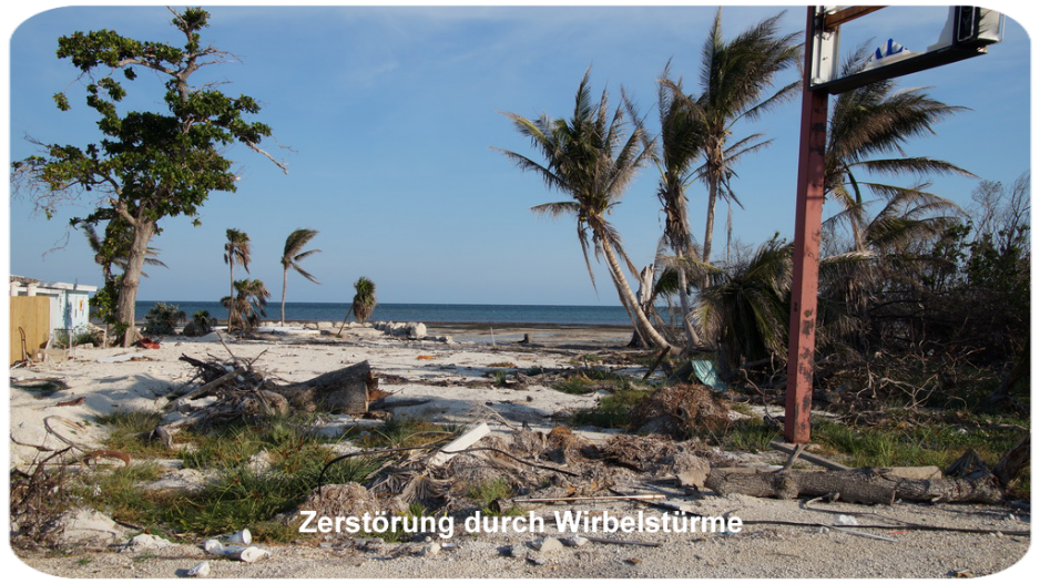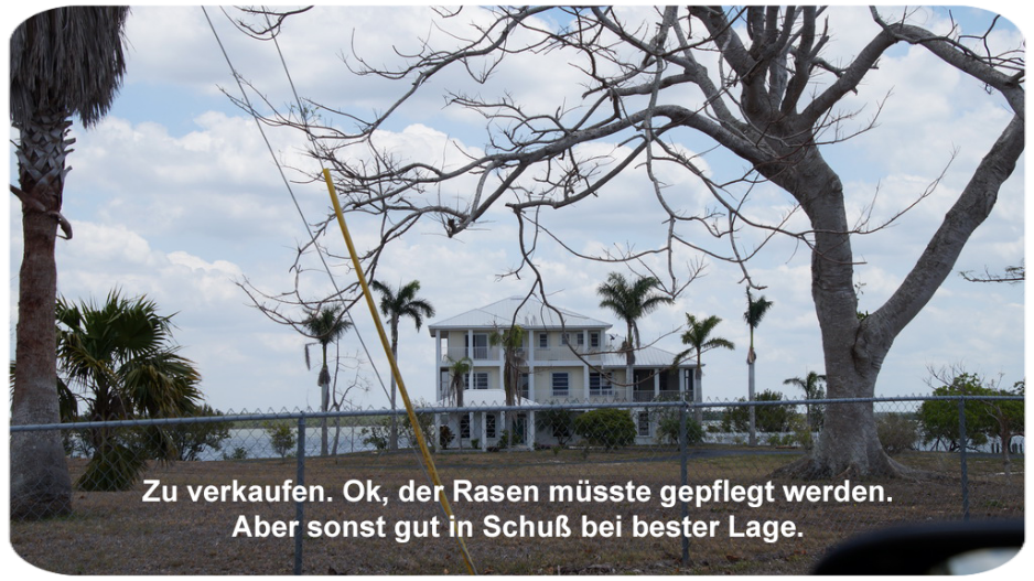 Leider hat die Schönheit im letzten Herbst gelitten, die meisten der einst über 10m hohen Palmen sind nur noch ca. 2-3m noch und die Blätter wachsen erst spärlich nach. Ettliche Häuser sind noch stark beschädigt oder komplett zerstört. Schuld daran ist diesmal aber nicht Trump, sondern die schweren Wirbelstürme, die sich im Herbst hauptsächlich in diesem Gebiet ausgetobt haben.