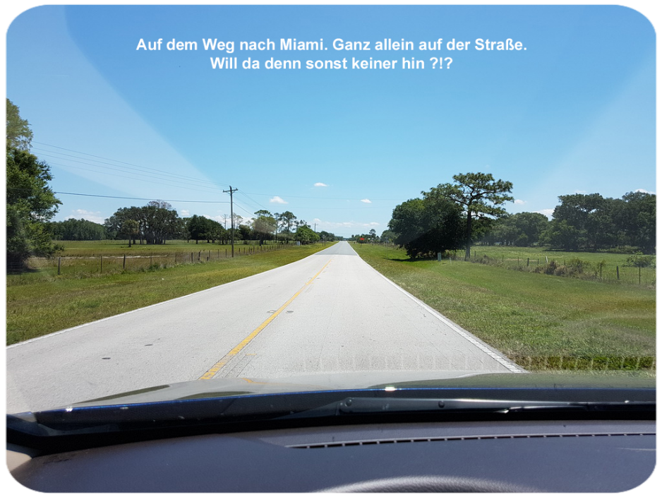Nachdem ich meinen Mietwagen von Flughafen in Orlando abgeholt hatte, machte ich mich gleich auf den Weg nach Miami. Die anderen vier waren früh am Morgen schon vor gefahren. Sie wollten die Zeit nutzen und sich unterwegs das Land anschauen. Dazu fuhren sie die Mautfreie Interstate entlang der Küste.
